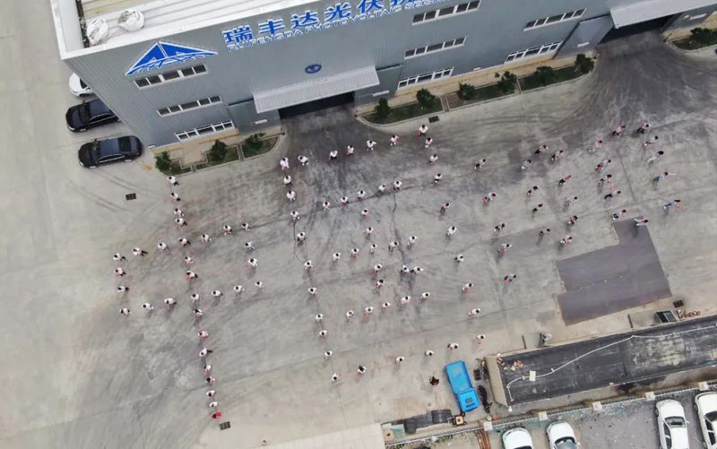 活動第一部分,全體員工在廠區門口空地上擺出”中國100“字樣,畫面十分氣派。
